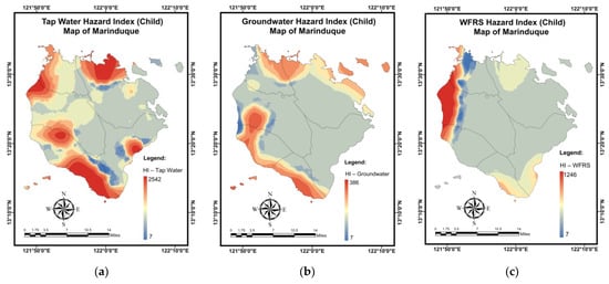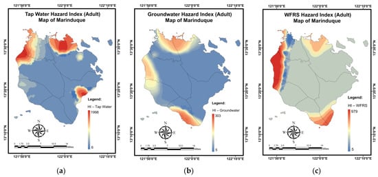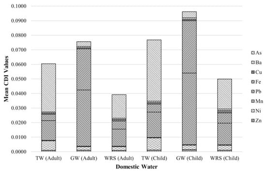 Table 8 presents the mean CDI of metals through the oral route from DW. The CDI values calculated for adults ranged from 0.0003 to 0.0386 for all DW sources. At the same time, the CDI values for children were observed to range from 0.0004 to 0.0491. The highest mean CDI, illustrated in Figure 4, for adults and children was observed for As for TW and WRS and Pb for GW. The smallest mean CDI for adults was observed for Mn for all DW samples. The study of de Jesus et al. (2021) in Marinduque also revealed high concentrations of Pb in the GW samples [58].