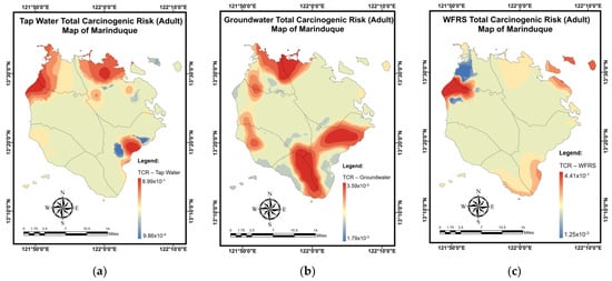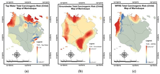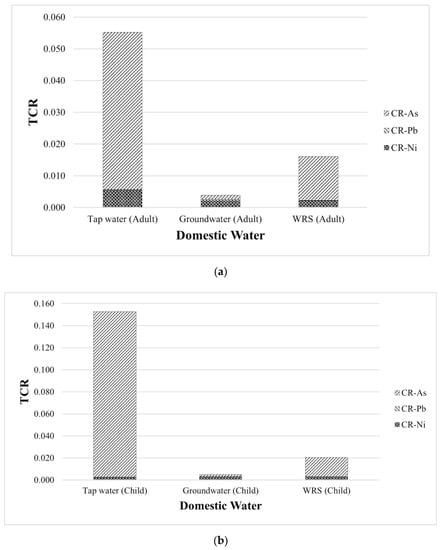 The TCR to residents through water intake from TW, GW, and WRS is summarized in Table 10. Among the studied target contaminants, only As, Pb, and Ni are categorized as carcinogenic metals by the International Agency for Research on Cancer (IARC) [60,61]. The adult carcinogenic risk for As ranged from 1.41 × 10−3 to 4.96 × 10−2; Pb from 8.92 × 10−5 to 4.16 × 10−4; and Ni from 2.07 × 10−3 to 5.50 × 10−3. The child carcinogenic risk for As ranged from 1.80 × 10−3 to 1.50 × 10−1; Pb from 1.14 × 10−4 to 5.29 × 10−4; and Ni from 2.35 × 10−3 to 2.76 × 10−3. The mean TCR was 2.51 × 10−2 and 5.95 × 10−2 for adults and children, respectively. All these risks were greater than the threshold value proposed by USEPA, which is 1 × 10−4 [62,63]. Having recorded these values, certain interventions and control measures are required to reduce the level of concentrations of HMM in the province and limit the population’s exposure. Adequate remediation and prompt onsite treatment to safeguard people’s health are necessary [64]. The TCR of the carcinogenic metals in all water sources were seen in the order As > Ni > Pb, and the TCR was in the order TW > WRS > GW both for adult and children, as shown in Figure 5.