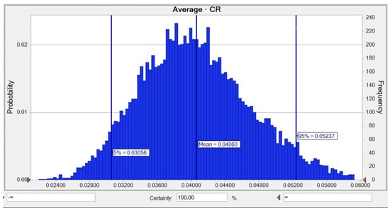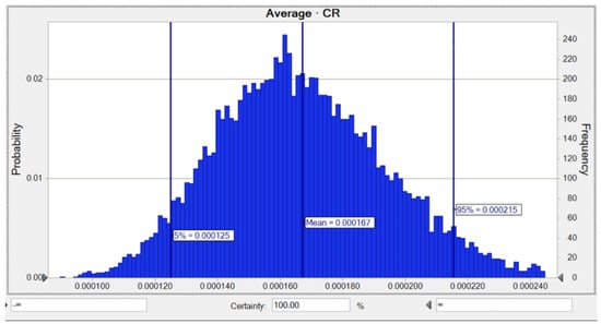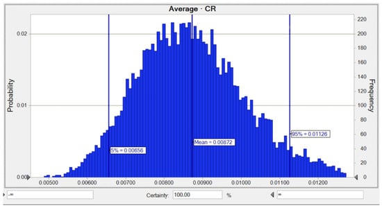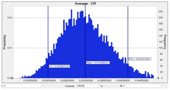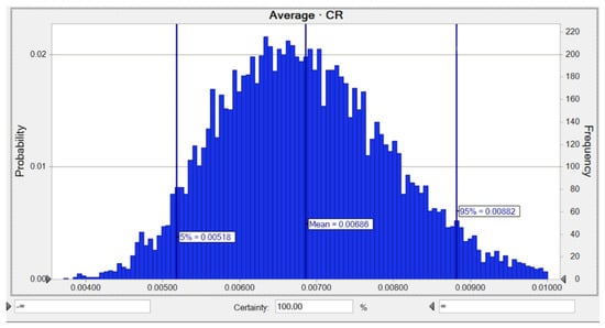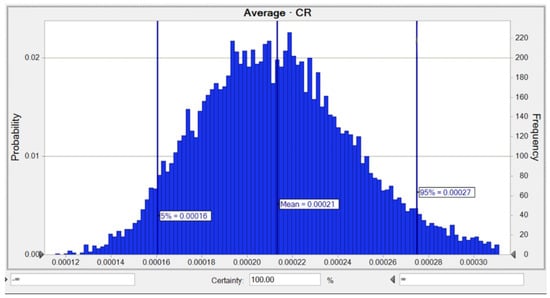 The sensitivity analysis (SA) approach was used to establish the impact of changing the values of the input variables on the CR estimate under a set of assumptions [50]. The SA was implemented using Oracle Crystal Ball® version 11.1.34,190, (Redwood, CA, USA) utilizing the MCS approach with 10,000 iterations in Excel software version 16.0.5332.1000 (Redmond, WA, USA).
