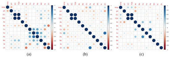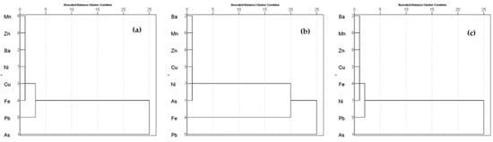 Using Excel software, descriptive statistics linked to the physicochemical parameters and HMM concentrations in the DW were evaluated to calculate the mean, standard deviation (SD), and coefficient of variance (CV). The CV was utilized to evaluate the dataset’s variability as follows: CV ≤ 15%, low; 15% < CV ≤ 35%, intermediate; and CV ≥ 35%, high [51,52,53]. A Pearson rank-order correlation analysis coupled with correlation matrix plots was also implemented utilizing IBM SPSS Statistics Version 26.0 and R Studio. Data on the metals concentrations in the domestic water were subjected to a hierarchical cluster analysis (CA) to find homogeneous groups. A dendrogram was likewise produced to analyze the cohesion of the clusters produced, in which relationships among components may easily be identified [54,55].