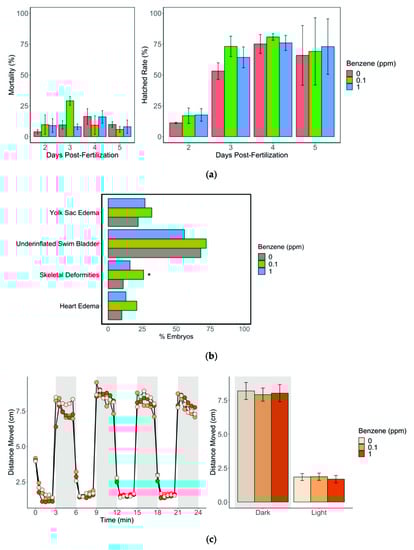 Phenotypic responses following benzene exposure from 4 h post-fertilization (hpf) to 5 days post-fertilization (dpf). (a) Average mortality (left) and hatch rate (right) of live embryos over the course of exposure period (n = 740 per treatment); (b) percentage of embryos with morphological abnormalities at 5 dpf per treatment (n = 134, 149, 146 for 0, 0.1, and 1 ppm benzene); or (c) average distance moved by larval zebrafish during light and dark cycles (n = 32 per treatment). * Condition is significantly different from control (0 ppm; p < 0.05).