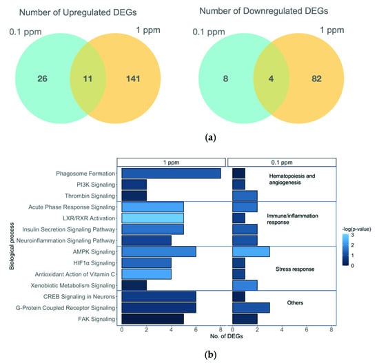 Transcriptomic responses following benzene exposure from 4 h post-fertilization to 5 days post-fertilization (dpf). (a) Venn diagram of the number of differentially expressed genes (DEGs) upregulated or downregulated at 0.1, 1 ppm, and both; and (b) number of DEGs implicated in top-rank canonical pathways.
