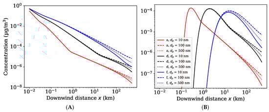 Ground level concentration (mass balance corrected) at the centerline of the plume as a function of downwind distance for a source height of (A) 2 m and (B) 50 m. Simulations for different particle sizes (10, 100 and 500 nm) and atmospheric stability classes (a, d, f) with a boundary layer height of 0.2 km and a wind speed of 10 m/s using Klug’s dispersion parametrization.