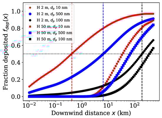 Fraction of ENM deposited to the ground for different particle sizes and source heights H. Vertical dashed lines represent the distances of 50% deposited, that is .
