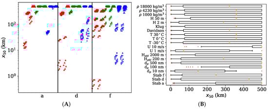 The distances for ENM simulations. (A) All data points grouped for the atmospheric stability classes (a, d, f). Circles correspond to the boundary layer height of 0.2 km and triangles the height of 2 km. Red markers have a particle size of 10 nm, green a size of 100 nm and blue a size of 500 nm. Smaller marker sizes represent the wind speed of 1 m/s and larger markers the speed of 10 m/s. (B) Sensitivity of the input parameters. The yellow line represents the median value of all observations for a certain parameter value. The boxes present 25 and 75% quartiles, while the whiskers correspond to the 5th and 95th percentiles. Red dots are outliers.