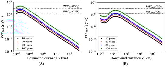 To have an idea of potential risks, the can be compared to predicted no effect concentration for soil organisms , which is 1000 g of nano-TiO per 1 kg of soil []. The concentration in soil reaches 0.7 times no effect concentration after 30 years, and further 2.3 times after 100 years of continuous emission. Moreover, values of / larger than unity are only reached in the vicinity of the source, that is closer than 50 m. Thus, it takes several decades to a century to reach concentrations that can potentially have environmental effects mainly at the close proximity of the handling facility. Note that potential ENM transformation and decay in soil [] is not considered here, which might affect the concentrations over such broad timescales.