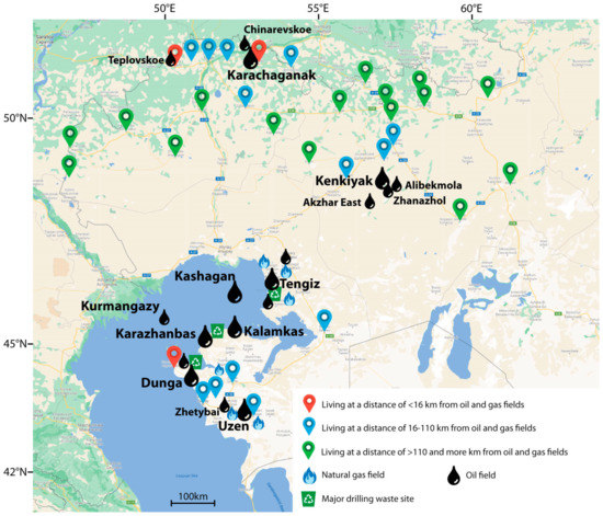 We compared the content of trace elements in the hair of residents living near the oil and gas fields fewer than 16 km, from 16 to 110, and more than 110 km, respectively. A distance of up to 16 km is considered the distance at which the consequences of the operation of the oil and gas facilities can affect the human body [33]. When comparing the content of trace elements, for the results of those living out of 110 km, we assumed them to be relatively uncontaminated [34]. Distances from the settlements to fields were calculated using Google Maps. For each location, we applied the coordinates taken from Wikipedia.