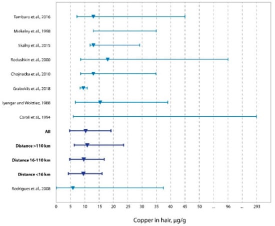 In Figure 2, we presented the distribution of copper concentrations in hair of the adult population of western Kazakhstan living in areas of different distances from oil and gas production zones compared to similar data on the child population of the same area [67], as well as the populations of Italy (Sicily) [74], Brazil [8], Russia [66], Sweden [72], Poland [73], and Canada [70]. This graph also includes data from the research by Iyengar et al. and Caroli et al., with accumulated findings from several studies [68,69]. Of the presented populations, the exposed ones included the population of children from Sicily living in the region of industrial pollution. The rest of the populations were not exposed or had both the exposed and the unexposed individuals (Iyengar et al., Caroli et al.). Noteworthy is the decrease in the median (10.35 µg/g) compared to the rest of the populations (Figure 2), except for a study also performed in western Kazakhstan, where the concentration of copper in children’s hair was found to be 9.5 µg/g.