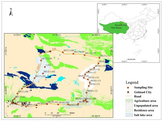 Samples were collected in August 2020 along a sampling route from G3011 and G109 to Naomuhong town, where the transect intersected with G315 to form a closed ring (Figure 1). From Nuomuhong to G315, economic (medlar) forests are widely distributed. A total of 32 surface soil samples were collected, including 7 samples in the agricultural areas, 7 samples in the unmanned areas, 4 samples in the residential areas, 4 samples in the salt lake areas, anfigurefid others collected on the highway roads. The samples were collected at a 10-cm × 10-cm × 2-cm volume in the surface layer [29], the sample was 2 cm in depth [29], and the average weight of collected samples was approximately 8 g. After being collected, the samples were placed into a polyethylene ziplocked bag, numbered, sealed, weighed, and taken back to the laboratory. Then, they were placed in a constant-temperature oven and dried at 60 °C until they reached a constant weight. Stones, roots, and other particles were removed from the samples by passing them through a 100-mesh sieve. Finally, the screened samples were packed into polyethylene ziplocked bags and stored after being numbered.