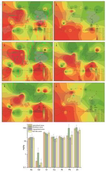 The spatial distributions of PTEs were obtained by deriving the spatial differences of the inverse distance weights of the PTEs (Figure 2). The highest values of As appeared in the unpopulated area (0816tr13), while the highest values of Cd, Cu, Pb, and Zn appeared in the residential area (0816tr01), which was located near a gas station. The maximum values of Cr and Ni were found in the saline lake area (0817tr05) and farmland area (0816tr12), respectively. By comparing the mean PTE values among different regions, we found few differences in the mean values of As, Cr, Cu, and Ni among different regions, the variations in the mean values of Cd, Pb, and Zn were relatively large. By combining these results with the spatial distributions of PTEs, the As, Cr, Cu, Pb, and Zn contents could be seen to be high in urban areas. However, the Cu and Ni element contents were high in agricultural areas.