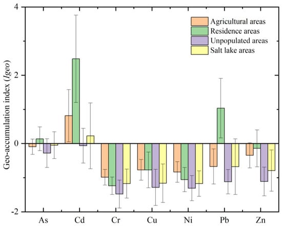 Average Igeo values of PTEs in the agricultural areas, residential areas, unpopulated areas, and saline lake areas in the Qaidam Basin on the northeastern Qinghai–Tibet Plateau.