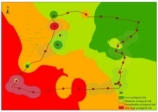 PTEs exert potential ecological risks to soil systems. The potential ecological risk index (RI) represents the sensitivity of a biological community to pollutants and illustrates the resulting potential ecological risk [33]. The equation used to calculate RI is as follows: