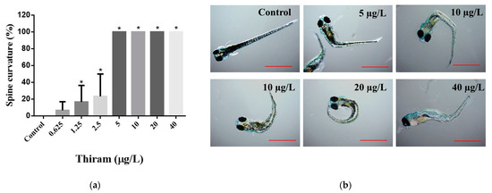 Spine curves of zebrafish induced at designated doses of thiram. (a) Graph shows the percentages of spine curves scored at 144 hpf. Data shown as mean ± SD were obtained from six plates (three independent experiments). Statistical differences were analyzed using an unpaired t-test; * p < 0.05. (b) Representative images showing thiram-induced spine curves at 144 hpf. Scale = 1.0 mm.