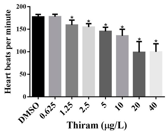 Average heartbeats per minute at designated concentrations of thiram. The heart beats were counted at 48 hpf. Data shown as mean ± SD were obtained from six plates (three independent experiments). Statistical differences were analyzed using an unpaired t-test; * p < 0.05.