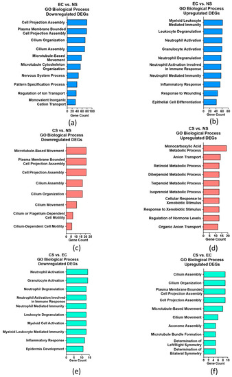 Top 10 enriched GO term annotations for each comparison. (a) Enriched downregulated biological processes in the EC vs. NS set. (b) Enriched upregulated biological processes in the EC vs. NS set. (c) Enriched downregulated biological processes in the CS vs. NS set. (d) Enriched upregulated biological processes in the CS vs. NS set. (e) Enriched downregulated biological processes in the CS vs. EC set. (f) Enriched upregulated biological processes in the CS vs. EC set. (FDR < 0.05). Biological processes were mainly related to cilia assembly (EC, CS) and immune response (EC).