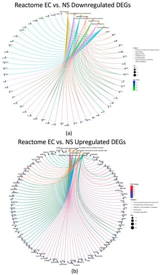 Top altered Reactome pathways and associated DEGs in the EC vs. NS set. (a) Pathways (light brown circles) enriched by downregulated DEGs in the EC vs. NS set. (b) Pathways (light brown circles) enriched by upregulated DEGs in the EC vs. NS set. Diagram shows the DEGs associated with each pathway and their fold changes (color key on right). Circle size key indicates the number of genes associated with each pathway. For (a), cilia assembly transcripts were down regulated. For (b), neutrophil degranulation was the major pathway. Images can be enlarged to read text.