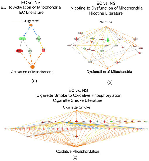 Mitochondrial pathways identified in the EC vs. NS set using IPA. (a) “Activation of Mitochondria” generated by overlaying our data on the EC literature. (b) “Dysfunction of Mitochondria” generated by overlaying our data on the nicotine literature. (c) “Oxidative Phosphorylation” generated by overlaying our data on the cigarette smoke literature. Upregulated DEGs are pink-to-red depending on fold-change, whereas green DEGs indicate downregulation. Orange arrows represent predicted activation, yellow arrows indicate non-consistent activation, and grey arrows represent effect not predicted. Images can be enlarged to read text.