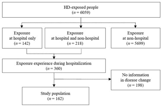 In addition, exposure experience prior to hospitalization was classified as ever or not. “Ever” exposure was defined when the subject had experienced any exposures to HD prior to hospitalization, and “non” was defined when subject had never experienced HD exposure prior to hospitalization (Figure 2).