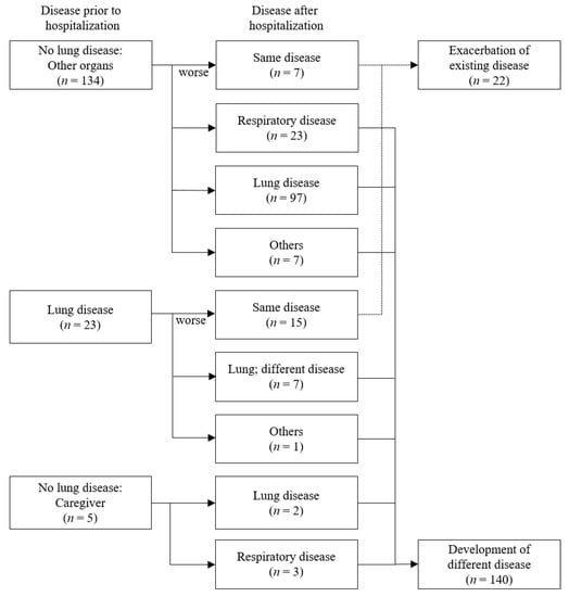 Figure 3 presents changes in disease status prior to and after hospitalization. Of a total of 162 subjects, 139 subjects (patients with no lung disease and caregivers) had no lung disease (i.e., other organ diseases and none) prior to hospitalization, and 23 subjects had lung diseases prior to hospitalization. Of these 139 subjects without lung diseases prior to hospitalization, 99 (71.2%) subjects had new-onset of lung diseases during hospitalization, and 26 (18.7%) subjects had new development of respiratory disease after hospitalization. Of those 23 subjects with lung diseases prior to hospitalization, 15 (65.2%) subjects had an exacerbation of existing lung diseases during hospitalization.