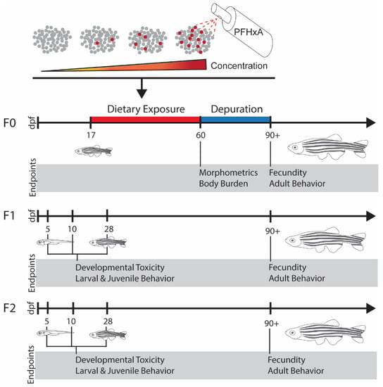 33]. The present study leveraged the zebrafish model to investigate health effects of dietary exposure to PFHxA in juvenile zebrafish during a critical period of gonadal development. Effects immediately following exposure, later in adulthood, and in subsequent generations were interrogated. Evaluating relevant diet concentrations previously reported in food and utilizing the sensitivity of zebrafish behavior endpoints across life stages and generations, this study contributes to our knowledge of PFHxA toxicity.