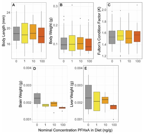 At 60 dpf, a subset of fish was sacrificed for weight and length measurements, also sampling for analytical measurement of body burden and organs. Prior to the sampling, tanks were fasted overnight to minimize the risk of PFHxA contamination of samples from food remaining in the gut. Following the sampling, remaining fish were maintained in the isolated intermittent flow system and fed uncontaminated GEMMA 300 (200–500 µm pellet size; Lot: 7268495) for a depuration period from 60 to 90 dpf. Water inputs increased during this time to 5–6 L each to maintain proper water quality conditions as the fish grew. At 90 dpf, following the completion of the depuration period, fish were transferred back to the constant flow-through system, where they were housed for the remainder of the study at densities of 16 fish per 2.8 L tank [