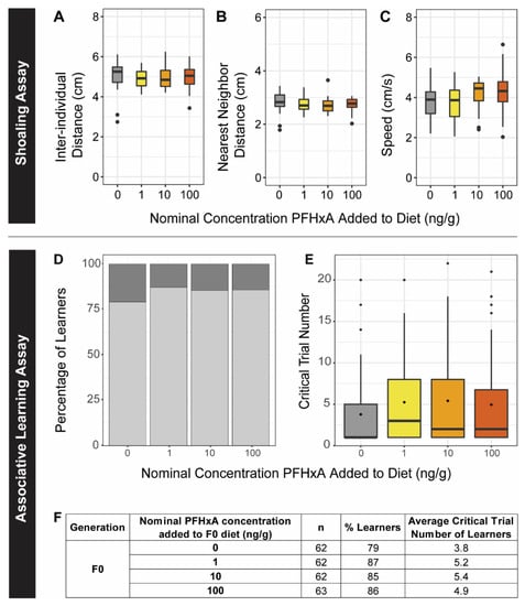 We utilized several adult behavior assays interrogating social interaction (shoaling), normal locomotion (free swim), predator, schooling, and startle response, and associative learning to investigate whether juvenile dietary exposure altered behavior later in life at 90+ dpf. All adult behavior assays were conducted within 3 weeks with the same cohort of fish. These assays were performed for the F0 exposure groups that were fed PFHxA-contaminated diet, and also for the F1 and the F2; assessment of the F2 generation enabled investigation of transgenerational effects.