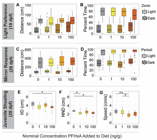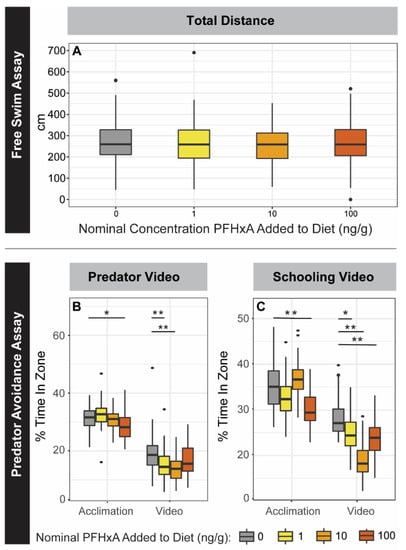 The PFHxA-contaminated diet fed to the F0 generation affected early development of the F1 generation, as evidenced by the abnormal larval behavior exhibited by the 10 ng/g exposure group lineage and juvenile shoaling behavior by all F1 groups. The present study used a comprehensive set of early developmental and juvenile behavior endpoints as indicators of biological perturbation. While longer-chain PFAS have been shown to transfer from mothers to embryos [