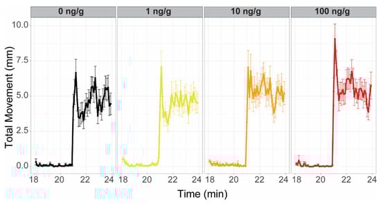 n = 31–40) were placed into 5 mL of water in each well. The assay lasted 12 min, consisting of first an acclimation period in the dark (0–6 min; IR) and then a light period (6–12 min; 550 Lux) during which visible light from underneath the plate stage created obvious light and dark zones. Total distance was calculated for every 30 s time bin, and after aggregating by mean, fish that had an average total distance of 0 for the entire dark acclimation period were removed from the analysis. Within the light period, the first 3 min were considered additional acclimation, and the last 3 min were analyzed. Total distance traveled and percent time spent in each zone were evaluated by aggregating means for each fish, and differences between control and treated groups were determined using a two-way ANOVA considering exposure group and zone, with a Tukey post-hoc test (