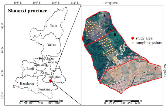 The city of Shangluo is located in the southeastern part of Shaanxi Province, China (Figure 1). It is between 108°34′20″–111°1′25″ E and 33°2′30″–34°24′40″ N and has a warm temperate climate. The annual average temperature is 7.8–13.9 °C; the annual average precipitation is 696.8–830.1 mm; the annual average sunshine duration is 1848.1–2055.8 h. The soil’s type is yellow cinnamon soil. A gold production company in the research area began operation in 1993; it ceased production after a dam failure in 2006. The comprehensive treatment project that adopted “microorganism + phytoremediation” technology for heavy metal pollution in farmland soil (area C) was launched by Shangluo Municipal Ecology Environment Bureau from 2016 to 2018. Even after several years, bare slag poses a serious threat to human health, and the research area is listed as one of the national key areas for heavy metal prevention and control. According to the Chinese Soil Environmental Quality Risk Control Standard for Soil Contamination of Development Land [22] and the Soil Environmental Quality Risk Control Standard for Soil Contamination of Agricultural Land [23], the study area can be divided into three subregions with different types (Figure 1). Area A is a pulp deposition area belonging to category 2 development lands where abandoned sludge accumulates with high heavy metal content. Area B is a hillside belonging to category 1 development lands, which is the buffer zone between the sludge deposition area and sloping farmland. Area C is farmland, belonging to agricultural land.