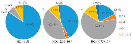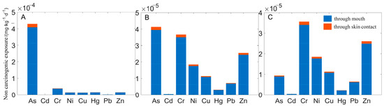 Noncarcinogenic exposure to heavy metals in soil. A, B and C represent area A, area B and area C, respectively.