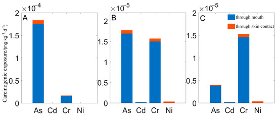 Carcinogenic exposure to heavy metals in soil. A, B and C represent area A, area B and area C, respectively.