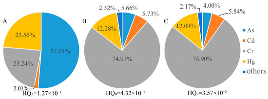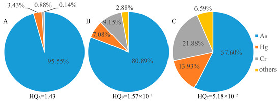 Figure 8 and Figure 9 show the carcinogenic and noncarcinogenic risk contribution rates of soil-heavy metals through mouth and skin contact. The noncarcinogenic risks of heavy metals in the three subregions were 1.55, 2.00 × 10−1 and 8.75 × 10−2, respectively. The top three heavy metal elements were As, Hg and Cr. The sum of the multipath carcinogenic risks of the heavy metals in the three subregions was higher than the maximum acceptable carcinogenic risk value, which is 3.51 × 10−4, 5.48 × 10−5 and 2.98 × 10−5. Notably, the carcinogenic risks of As in areas A, B, and C were 3.26 × 10−4, 3.14 × 10−5, and 7.13 × 10−6, respectively. The highest contribution rate was in area A, up to 84.44%. The carcinogenic risk of Cr was 2.34 × 10−5, 2.18 × 10−5 and 2.12 × 10−5, respectively, in areas A, B, and C. The highest contribution rate of total carcinogenic risk in area C was 85.82%.