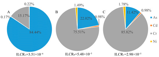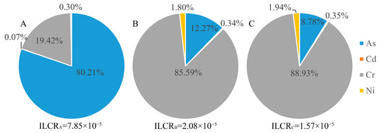 Carcinogenic risk contribution rate for oral intake of heavy metals in soil. A, B and C represent area A, area B and area C, respectively.
