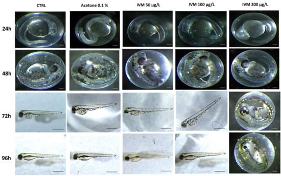 - Oliveira, R.; Grisolia, C.K.; Monteiro, M.S.; Soares, A.M.; Domingues, I. Multilevel assessment of ivermectin effects using different zebrafish life stages. Comp. Biochem. Physiol. Part C Toxicol. Pharmacol. 2016, 187, 50–61. [Google Scholar] [CrossRef] [PubMed]
