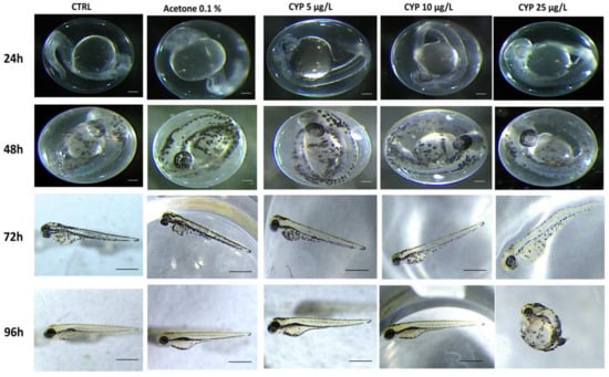 Optical micrographs showing physical malformation in comparison with control after incubation with CYP and acetone 0.1% for 96 hpf.