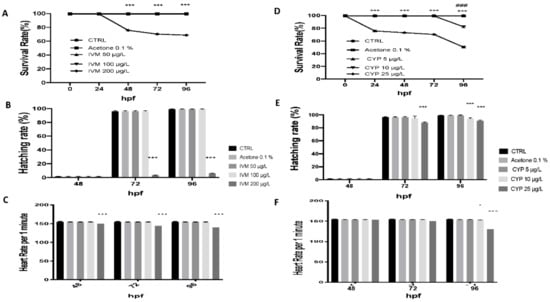 The survival hatching and heart rate of embryos exposed to different concentrations of IVM (A–C) and CYP (D–F), respectively, were determined at the designate time. Values = means ± SD of three independent experiment data: *** at p < 0.001 against CTRL. Photographs are representative of the experimental group’s situation (n = 20).
