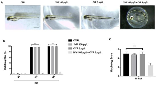 Effects of single and co-exposure of IVM and CYP on morphological changes in zebrafish larvae at 96 hpf (A). Hatching rate (B) and morphological scoring (C). Values = means ± SD of three independent experimental datapoints: *** at p < 0.001 against IVM+CYP.