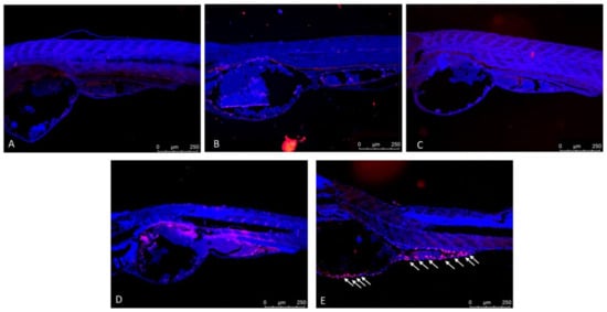 TUNEL assays indicated an abnormal apoptotic pattern. TUNEL-positive apoptotic cells (white arrow) in zebrafish embryos treated with IVM and CYP at 96 hpf. CTRL (A), acetone (B), IVM (C), CYP (D), and IVM + CYP (E).