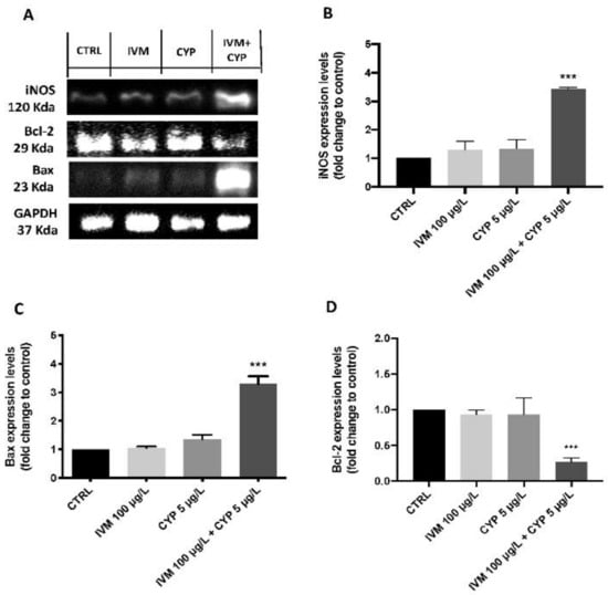 Next, we performed a representative Western blot of iNOS and apoptotic-related proteins (Bax and Bcl-2), which play a role in the molecular pathway of IVM and CYP toxicity. The results indicated a significant increase the iNOS protein level in the co-exposure of IVM and CYP, while no effect was seen in the single-exposure group (Figure 6). The levels of apoptosis-related proteins (Bax and Bcl-2) increased after co-exposure of IVM and CYP compared to CTRL (Figure 7), while the level of Bcl-2 was downregulated. No difference in the single-exposure group was seen compared to CTRL group for the Bax and Bcl-2 expression (Figure 7).