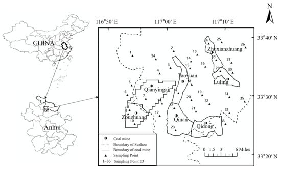The Sunan mining area (33°21′–33°42′ N, 116°45′–117°12′ E) is located in the middle of Huaibei Plain southeast of Suzhou City in China (Figure 1). The Sunan mining area is a vital coal production base in East China. Seven production mines, including Luling, Zhuxianzhuang, Qianyingzi, Zouzhuang, Taoyuan, Qinan, and Qidong, are situated in an area of approximately 450 km2. This area has a high population density and groundwater is used for both various human requirements and irrigation. In the process of coal mining, gangue, domestic wastewater, and agricultural non-point source pollution affect the hydrogeochemical characteristics of shallow groundwater; this can lead to organic or inorganic pollution and threaten groundwater quality and water supply security [].
