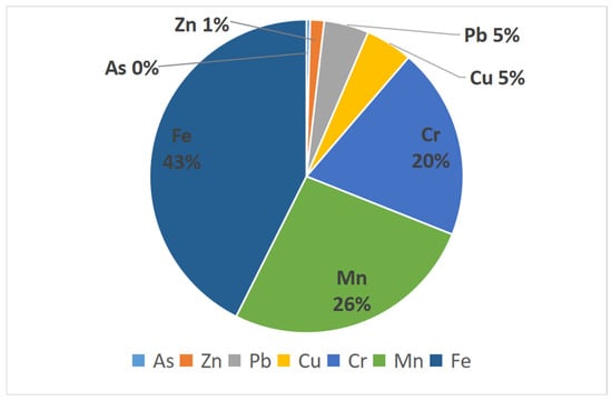 The reference value of the risk level recommended by some agencies is tabulated in Table 5. The calculated non-carcinogenic health risk values for the seven heavy metal elements, As, Cr, Cu, Fe, Mn, Pb, and Zn, are shown in the table, with a maximum value of 9.20 × 10−9 (Table 9). The total non-carcinogenic health risks are well below the negligible level stipulated by the agencies (Table 5). The results show that the level of non-carcinogenic health risk caused by heavy metals in shallow groundwater is low and does not cause significant harm to humans. After calculations of non-carcinogenic health risk values, it has been found that the contribution of the seven heavy metals to the non-carcinogenic health risk was in the order of Fe > Mn > Cr > Cu > Pb > Zn > As. Among them, Fe and Mn contributed the most, accounting for 43% and 26% of the total risk values, respectively (Figure 3).