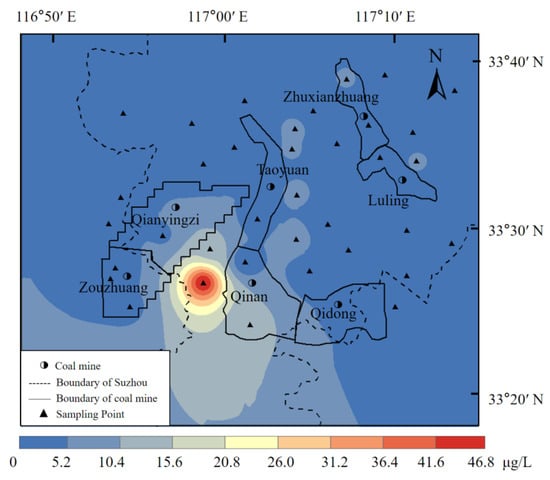 Although coal is an important source of energy, hazardous elements may be released into the environment during coal exploration, washing, and other processes in mining areas [,,,]. In addition, agricultural production may lead to the discharge of wastewater carrying pesticides and fertilizers, contributing to groundwater pollution. The discharge of domestic sewage and industrial wastewater may also cause groundwater pollution []. Health Risk Assessment (HRA) is a quantitative description of the risk degree of environmental pollutants harmful to human health by linking health with environmental pollution and taking the risk degree as the evaluation standard []. In this study, Health Risk Assessment was used to objectively estimate the degree of impact from damage by heavy metals pollution in groundwater on human health []. The purpose of this evaluation is to provide scientific support for health risk management, domestic water safety, and water environment protection [,,,,]. Studying the health risks of heavy metals pollution of groundwater in coal mining areas can find out whether the groundwater was severely contaminated by coal mining activities, and thus provide a basis for groundwater protection policies [,,].