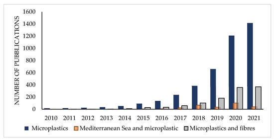 Plastic is considered a persistent and ubiquitous pollutant, and it is considered among the top environmental concerns of the Anthropocene [1,2]. Microplastics (MPs) are small plastic fragments ranging from 1 μm to 5 mm in size that can be found in different environmental compartments [3]. MPs accumulate in the environment and increase stress on the marine, freshwater and terrestrial ecosystems [4]. Several studies have evidenced their presence in the marine environment [5,6,7], aquatic sediments [8], freshwaters [9], soils [10] and the atmosphere [11,12]. MPs can act as a carrier of hydrophobic organic contaminants, transporting the pollutants inside the organisms through ingestion and subsequent chemical release. However, it has been shown that sometimes, ingested MPs can adsorb the pollutants already present in the organisms and remove them once they are excreted [13]. Plastics themselves contain toxic chemical additives (such as plasticizers, antistatic agents, flame retardants, heat stabilizers, acid scavengers, colorants, etc.) that can be released into the environment [14]. Moreover, chemical additives in plastics can adsorb organic contaminants from other matrices and increase the exposure of several contaminants to the environment [15,16]. These chemicals, if present in the food chain and absorbed by humans, could cause many diseases linked with hormonal disruption, reproductive problems, nervous tissue, liver and kidney damage, etc. [17]. Although the effects of plastic litter on the marine environment and organisms have been recently investigated in several oceanic areas, more information is needed for the Mediterranean Sea [18], which is an enclosed sea with limited exchange with the ocean basins and high diversity of sensitive ecosystems. This particularity, together with other factors such as the high-density population in the coastal areas, intense navigation traffic, and industrial and fishing activities, makes the Mediterranean basin one of the most affected seas by plastic accumulation all over the world [19]. The determination and characterization of MPs for shape, color, size and type is fundamental to better understand their impact on the environment. Among MPs, fibers are the predominant shape in the aquatic environment, often accounting for more than 80% of the total items [11,20,21,22,23,24,25,26,27,28,29,30,31,32,33]. For this reason, increasing attention is being paid to micro-fibers and their potential toxicological and environmental effects, as evidenced by the growing number of studies on microfiber pollution over the past decade (Figure 1). According to the general definition proposed by Liu et al. (2019), microfibers (MFs) are any natural or artificial fibrous materials of threadlike structure with a diameter less than 50 μm, length ranging from 1 μm to 5 mm, and length to diameter ratio greater than 100 [34].