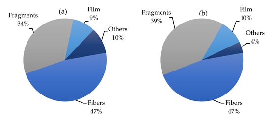Figure 2 summarizes all data presented in Table 1 and Table 2, providing a global view of the occurrence of fibers, fragments, films and other shapes (i.e., spheres, pellets, sheets) in the Mediterranean Sea. The uniformly high presence of MFs in the water environment and biota samples of the Mediterranean area reflect a wider distribution of sources of textile fibers along the coastlines of the Mediterranean Sea, but also, the potential for atmospheric transport is much higher for MFs than for MPs [38].