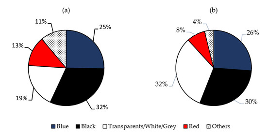 From the available literature data, four different colors in MFs were found to be more abundant in the Mediterranean Sea, both in biota (fishes, invertebrates and sea turtles) and in the seabed and seawater samples. As indicated in Figure 3, the dominant color was black (ranged between 12.1–100%), followed by transparent and clear colors (2.5–50.3%) and blue (10.1–45.8%). Red (3.8–27%) and others (2.2–20%) were less abundant.