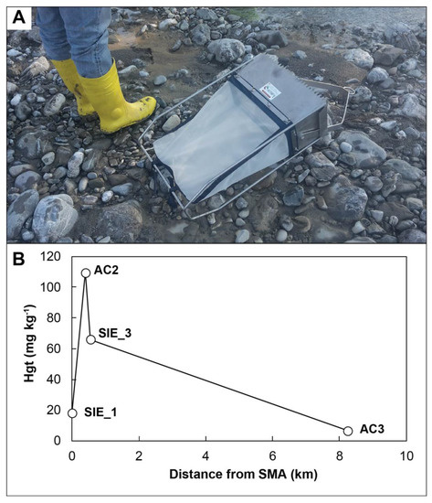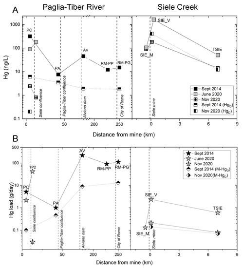 - Gray, J.E.; Rimondi, V.; Costagliola, P.; Vaselli, O.; Lattanzi, P. Long-distance transport of Hg, Sb, and As from a mined area, conversion of Hg to methyl-Hg, and uptake of Hg by fish on the Tiber River basin, west-central Italy. Environ. Geochem. Health 2013, 36, 145–157. [Google Scholar] [CrossRef]