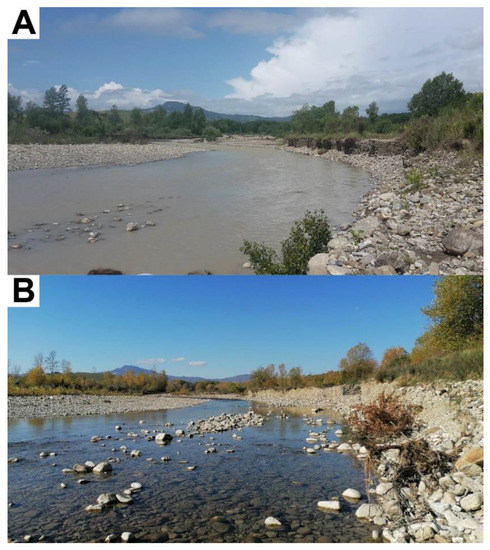 - Cencetti, C.; De Rosa, P.; Fredduzzi, A.; Tacconi, P. L’approccio morfologico-sedimentario nello studio dei corsi d’acqua: Dinamica fluviale, processi di erosione, rischio da dinamica d’alveo e rischio idraulico. In Atti del Convegno “Dal Fiume al Mare—Ripensare il Litorale Romano Secondo Natura” (Ostia, 12 Ottobre 2019). Collana “Culture, Territori, Linguaggi”; Cencetti, C., Ruggiero, D., Eds.; Università degli Studi di Perugia: Perugia, Italy, 2020; Volume 18, pp. 25–52. ISBN 9788894469721. Available online: http://www.ctl.unipg.it/issues/CTL_18.pdf (accessed on 5 May 2021). (In Italian)
