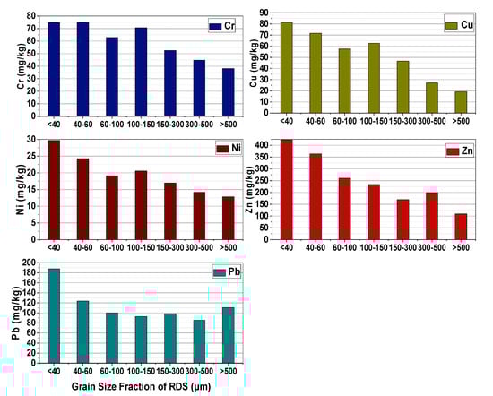 In these metals, Zn has the highest concentration in the grain size fractions of <40, 40–60, 60–100, 100–150, 150–300, and 300–500 µm, while Ni has the lowest concentration, but for the grain size fraction of >500 µm, Pb has the highest concentration. Most heavy metal concentrations were substantially greater than their respective background values. The highest metal concentrations were found in the tiniest RDS particles <40 µm for all the metals except for Cr, where the highest concentration found in 40–60 µm size fraction. However, the lowest concentrations of all the heavy metals were found in the grain size of >500 µm except for Pb, which has the lowest concentration value in the grain size fraction of 300–500 µm. By and large, the fractions with smaller particle sizes had more heavy metals in them.