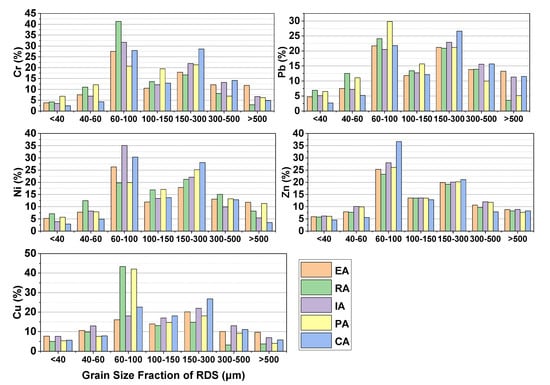 In the occurrence of heavy metals, this study looked at five different metals (Cr, Cu, Ni, Zn, and Pb) in each size group of the RDS (Figure 2), and background values of these heavy metals in Zhengzhou were 64, 14, 21, 42, and 18, respectively [].
