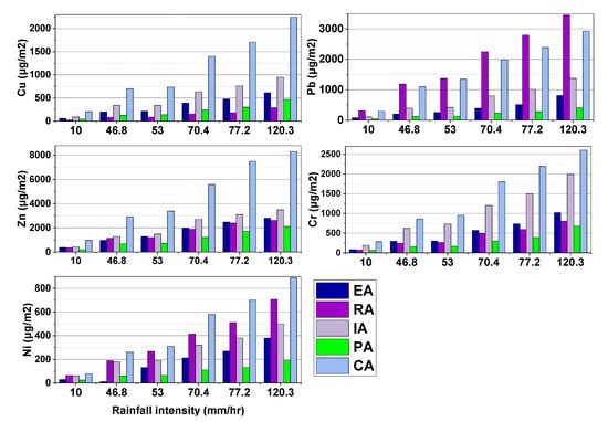 Using RDS washed off impermeable surfaces, Figure 4 depicts the possible contribution to surface runoff pollution of washed-off RDS. For Cr and Ni at (10–120.3 mm/h) and Zn and Pb at (10–53 mm/h), the areas for possible pollution contribution per unit area of impervious surface were as follows: CA > IA > EA > RA > PA. CA > IA > RA > EA > PA was the order for Cu (10–120.3 mm/h) and Pb and Zn (53–120.3 mm/h). The disparity between RDS and the metals linked to it in terms of potential pollution contribution per unit area grows higher as rainfall intensity increases. This could be explained by the fact that smaller particles have higher mobility and GSFLoad than larger ones.